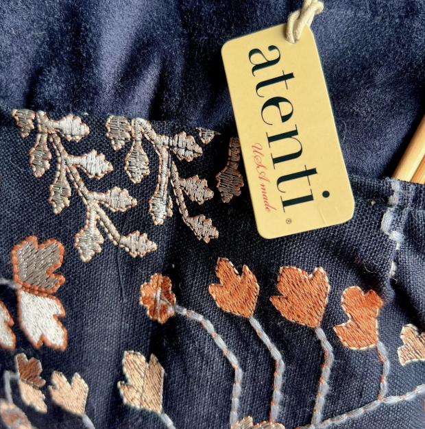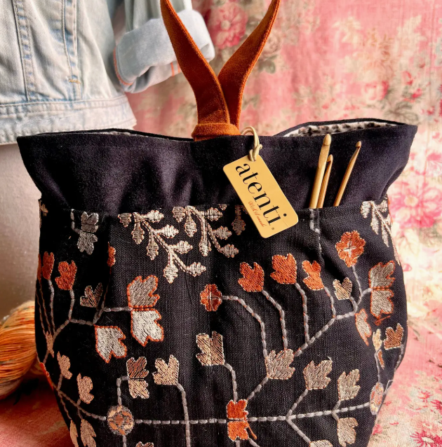 Be awestruck by the beauty of the Twinkle tall Caddy. Its embroidered tapestry-like background of autumnal leaves on a dark backdrop is matched with a twinkling interior fabric, bringing understated elegance and a surprising pop! This taller version of our best selling Caddy, is a stand-alone, carry around organizer and is perfect to store and keep all your tools and notions handy. It’s fully lined and has four outside and four inside pockets with an ample center well. Thread the ultra suede handle through the closure loop to secure and as a carrying option. The Tall Caddy provides storage that is designed to be both efficient and stylish while all of your crafting items will stay organized and secure. Dimension: about 10.00"W x 11.00"H x 6.50"D